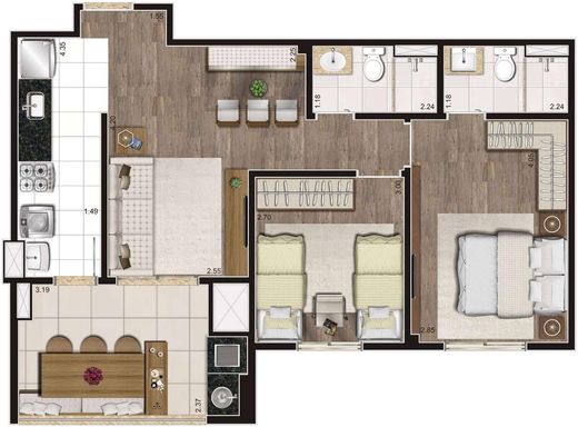 - Porcelanato grande retificado e vinílico nos dorms